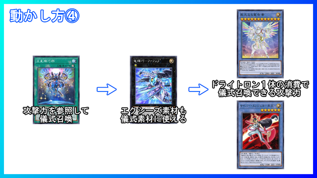 《流星輝巧群》は出したい儀式モンスターの攻撃力を超える分のモンスターをリリースして儀式召喚を行うカードです。《崇高なる宣告者》や《サイバー・エンジェル―弁天―》はどちらも下級の「ドライトロン」モンスター1体で儀式召喚できます。