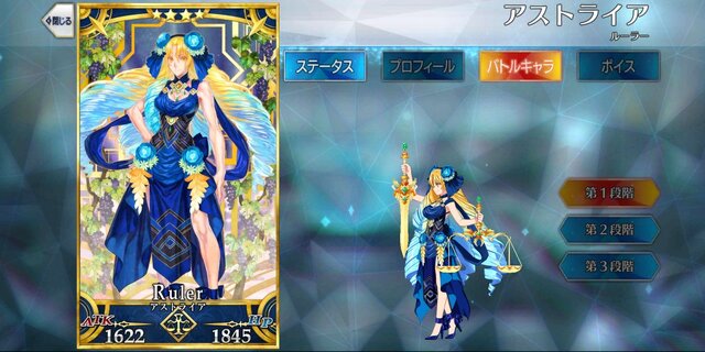 単体攻撃宝具持ちでもう1騎ピックアップしたいのが、「アストライア」。クラスは「ルーラー」なので、多くのクラス相手に防御面で有利が取れます。その分、攻撃有利が取れる相手はムーンキャンサーに限られるので、与ダメージの大半が等倍になる点はちょっとしたネックです。