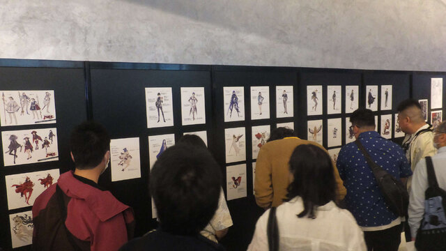 展示物の2列目も開発資料のコーナーですが、こちらはキャラクターの設定画やメインアートなどが占めており、ビジュアル面の魅力がダイレクトに伝わってきます。来場者による展示物の撮影は禁止だったため、その目に焼き付けるように注視する様子も印象的でした。