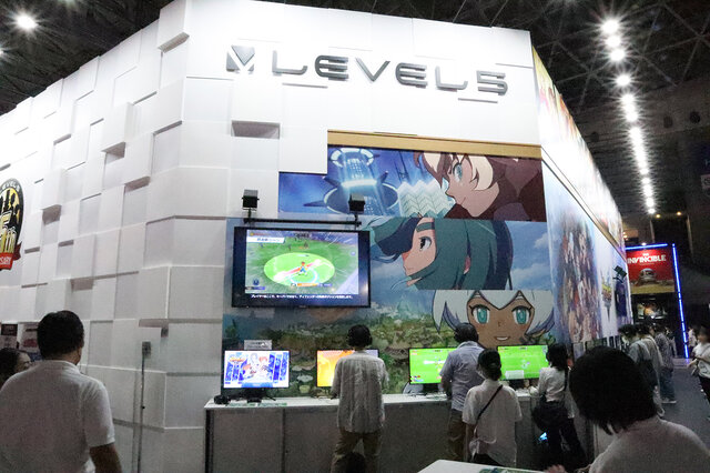 レベルファイブのブースの様子。試遊可能な3作品からそれぞれを象徴するキャラクターが壁面を飾っています。本作からはふしぎな少女「レム」がブースを彩ります。