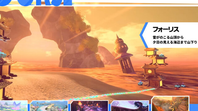 公開されたのはディレクター桜井政博氏がプレイしながら「フォーリス」を解説するという動画。同コースは山下りコースとなっており、公式サイトの紹介文では「雪がのこる山頂から夕日の見える海辺まで山下り」とされています。