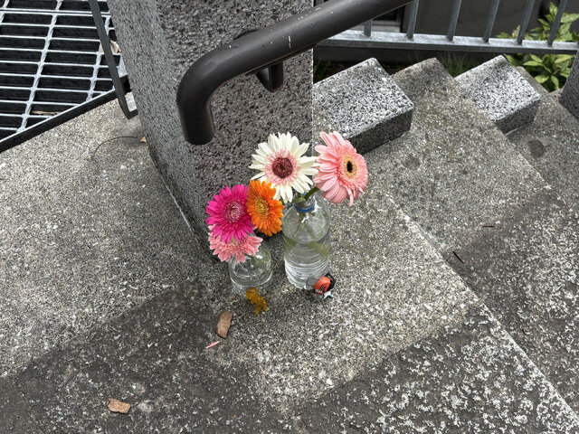 踊り場にはガーベラの花が供えられていた。これはファンの仕業に違いない。