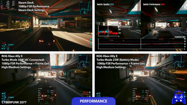 負荷の高いドライブの場面でSteam Deckは約25fps、スイッチ2のクオリティモードでは約27fps、パフォーマンスモードでは約29fpsであったのに対し、Xbox Ally Xの電源接続モードでは約75fps、ターボモードでもほぼ同等の約79fpsと、圧倒的な性能差をXbox Ally Xは示しています。