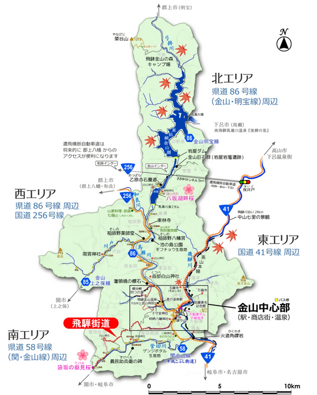 岐阜県下呂市金山町は、下呂市最南端に位置する自然豊かな山里で、かつて飛騨街道の宿場町として栄えた歴史を持っています。飛騨川と馬瀬川の合流地点にあり、縄文時代の「金山巨石群」や「中山七里」といった景勝地が多くあり、現在では古い町並みを残す「筋骨めぐり」がとくに人気で、昭和の雰囲気が感じられる随一のエリアです。