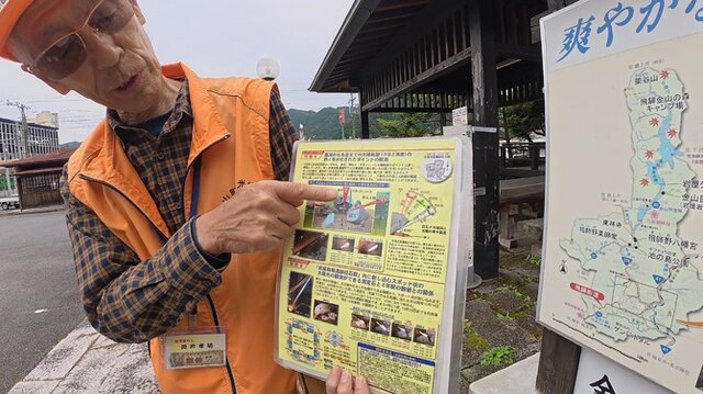 そしていよいよ11時。案内所で待っていると「金山町観光協会」の服を着た方が来られました。案内役は、ベテランガイドの「岡戸孝明さん」です。岡戸さんは、長年この筋骨めぐりの案内人としてご活躍されており、温和なお人柄と圧倒的な知識量とユーモアを交えた軽妙な語り口が特徴的で、まさにその道のプロといった感じでした。