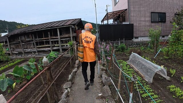 この一本道をひたすらに歩いていきます。両脇には畑がありますが、通路は狭く家と家の距離が非常に近い。岡戸さん曰く、皆が限られた土地の中で商売し生活するためには「間口」を分け合わなければならないので、こうした構造になったということです。
