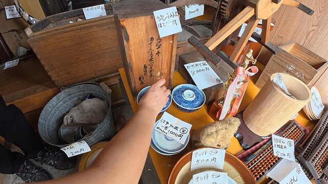 階段を上りきった先に、岡戸さんが経営する雑貨店「古もん屋」2号店があるので立ち寄ります。ちょうど新しいお茶碗を探していたため、軒先に置いてあった年代もののお茶碗をセットで購入しました。小ぶりな器が可愛らしいです。なんと、サービスで小皿も2枚オマケしてくれました。ありがとうございます…!
