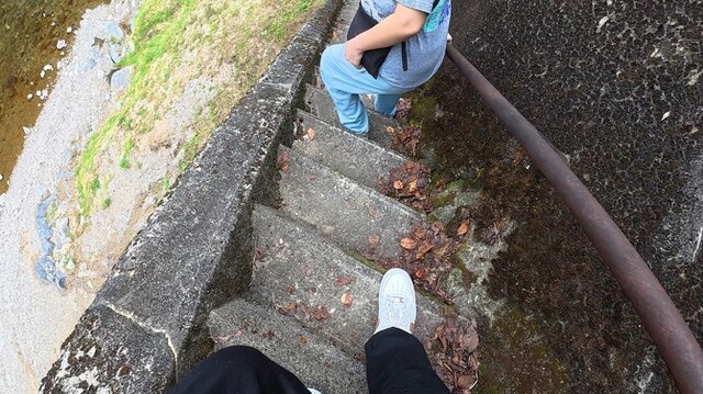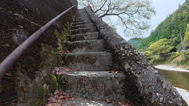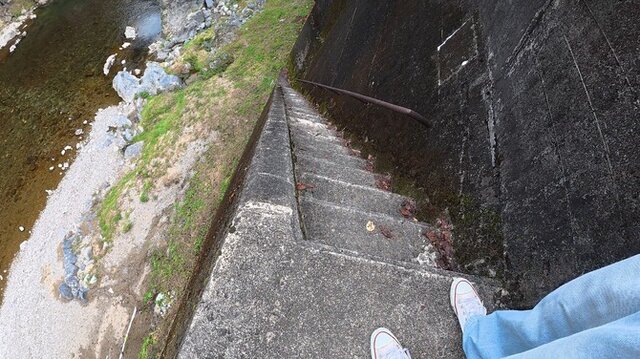 なぜここを訪ねたのかというと、橋のほとりにある「角度がエグい」と噂の“最恐の階段”を見るため。ご覧ください、このほぼ垂直に伸びた姿を。遠目に見ると階段というか、まるでハシゴみたいですね。この異様な風景がSNSでバズり、果ては各テレビ局も特集を組むほど一時話題沸騰となりました。