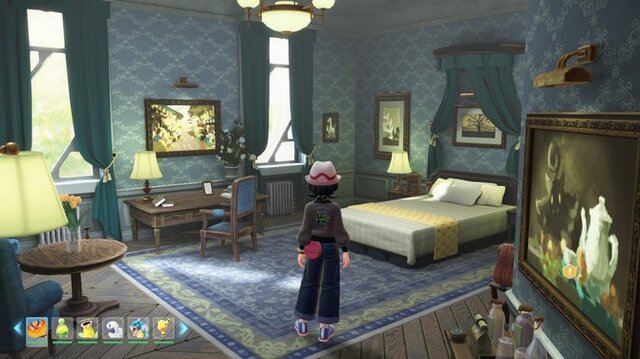 街の中には別のマップとして入れる場所として主人公たちが暮らす「ホテルZ」やマチエールがいる「ハンサムハウス」、「ミアレ美術館」「ポケモン研究所」などがあります。広いマップと比べると、屋内としてしっかり表現している印象。ホテルは朝と夜で異なる雰囲気をを演出できています。そして美術館は展示とライティングが良くできており、本物の美術館にいるような感覚でした。