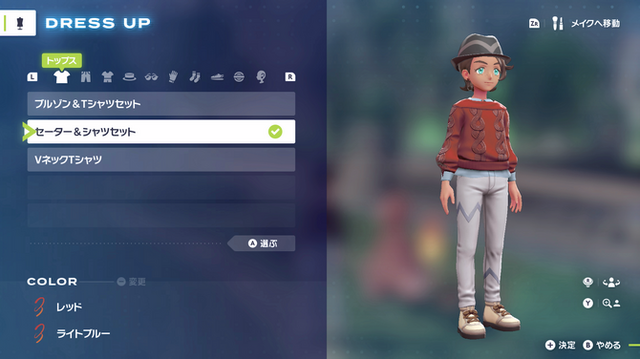 トップスはセーターとシャツの重ね着。ミアレシティのモデルとなった街、パリの10月平均気温は16度ほどだそうですので、あんまり薄着過ぎても寒そうですしね。ヘッドギアはミアレに到着して間もない頃にピュールからもらったソフトハットです。シルエットが好きなのでそのまま着用しています。ボトムスは白のスキニーパンツ。ハットのラインと似たような意匠があったため、合わせで選択しました。そしてトップス・ボトムスを合わせて見るとこっそりモンスターボール色になっています。