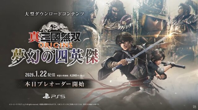 コーエーテクモゲームスは、ソニー・インタラクティブエンタテインメントが11月12日に配信した「State of Play 日本」にて『真・三國無双 ORIGINS』のDLC「夢幻の四英傑」を発表しました。2026年1月22日配信で、本日よりプレオーダーもスタートしています。