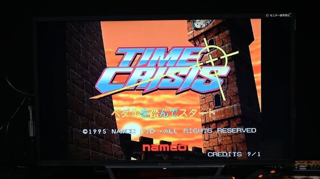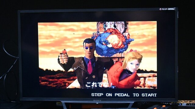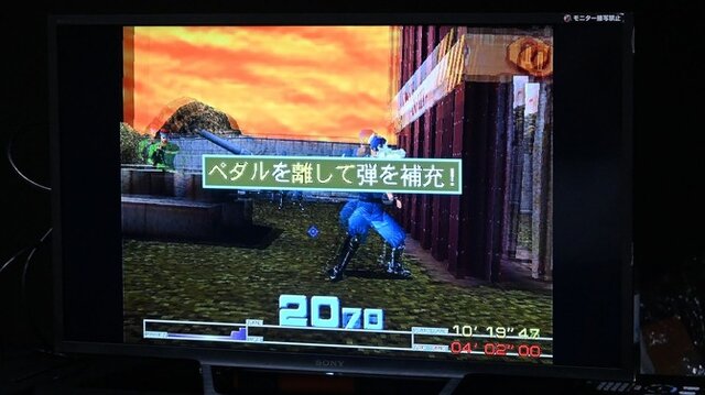 プレイしていると段々腕がプルプルして照準が定まらなくなってきたり、ペダルに添えている足が疲れてきたりするという懐かしの体験も。感覚もゲームセンターそのものです。
