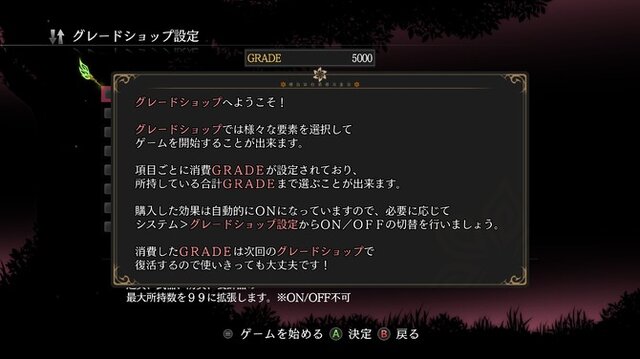 グレードショップを簡単に説明すると、本編をクリアした後の周回プレイにおいて、より有利な条件で再スタートができるという仕組みです。アイテムの引き継ぎや獲得経験値の増加などを設定でき、いわゆる“強くてニューゲーム”を楽しめるシステムと言えます。