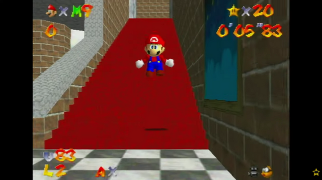 そんな『スーパーマリオ64』RTAの代表的なテクニックのひとつが、後ろ向きの状態で異常な加速を得るBLJ(Backwards Long Jump)通称“ケツワープ”です。このテクニックは、階段などで後ろ向きに幅跳びを行い特定の操作をすることで、マリオが想定外の速度を得て、特定の扉や坂を強引に突破できるようになります。