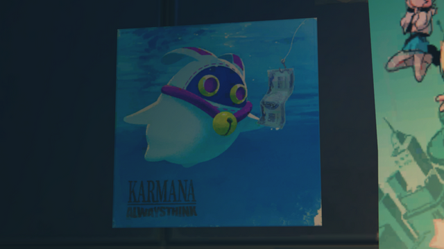 ちなみに、ライブハウス内のポスターには世界的ロックバンド「ニルヴァーナ」の赤ちゃんが遊泳するアルバムジャケットとよく似たものもあり、こちらではゲーム内マスコット「オマネキボンプ」が映った“KARMANA”なるバンドのものとなっています。