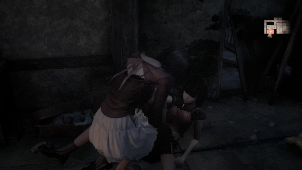 同行者の繭も怨霊の攻撃を受けると転倒してしまうので注意が必要です。特に複数の怨霊との戦闘ではフィルムの装填が間に合わず、ゲームオーバーになりかねないため、繭が転倒したら隙を見てすぐに助け起こしたほうが賢明でしょう。