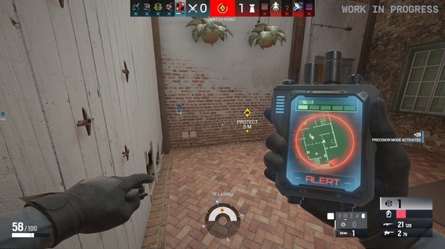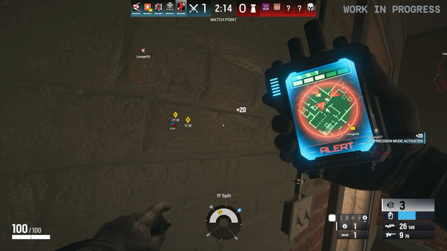 攻撃側オペレーターの「ソリッド・スネーク」が持つ固有ガジェットは、『メタルギアソリッド』シリーズお馴染みの「ソリトンレーダー」。構えることで周囲のレーダーが表示され、その範囲内に脅威(敵)がいるとアラート状態となり、精密モード(PC版ではF長押し)をすることで敵の位置と向いている方向が数秒わかるという代物です。サブガジェットはスタングレネードに加え、グレネードやインパクトEMP、ブリーチングチャージなど、複数から選択することが可能です。
