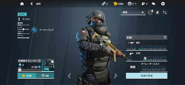 「Rook」は味方のアーマーを強化し、ヘッドショット以外のダメージでは一度負傷(ダウン)状態にしてくれる「アーマープレート」を設置するオペレーターです。このオペレーターの仕事は、ラウンド開始後、その場に置くだけ。パンチには欠けるものの、たった5秒で完了して、味方の役に立てる、そして武器「MP5」も使いやすい。初心者にはうってつけのオペレーターです。