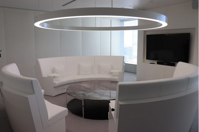 次は会議室へ。白いソファが机を丸く囲むこの空間は、月面基地がコンセプト。机も月のクレーターを思わせるデザインです。TVの下に見えるカメラから見た際に、宇宙船内部のようにみえるそうです。