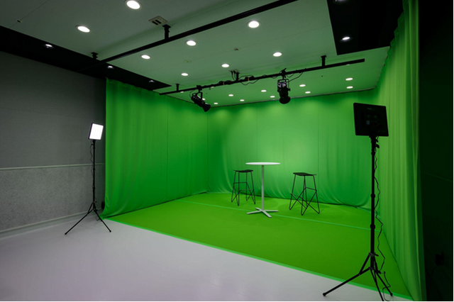 こちらが撮影スタジオ。グリーンバック・ブルーバック完備で、簡単な動画撮影や素材撮影などに使用されるそうです。