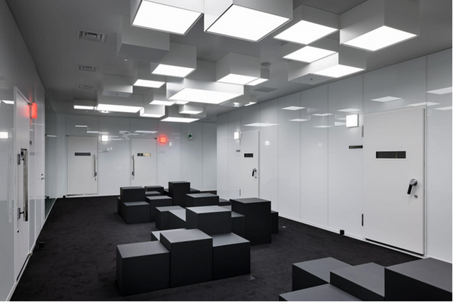 各スタジオや作業部屋間には待機スペースも。黒いブロック型の家具が設置されているのが目を引きます。机用の背が高いブロックと、座る用の背が低いブロックで、しっかり質感が違うのが印象的でした。