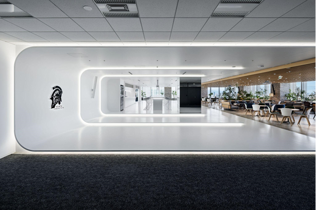 この空間は鏡面になっており、左右の空間が無限に続いているように感じます。正面から見て左が過去、右が未来を示しているといいます。こんな空間があるゲーム会社、他に考えられませんね。