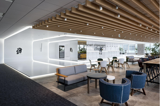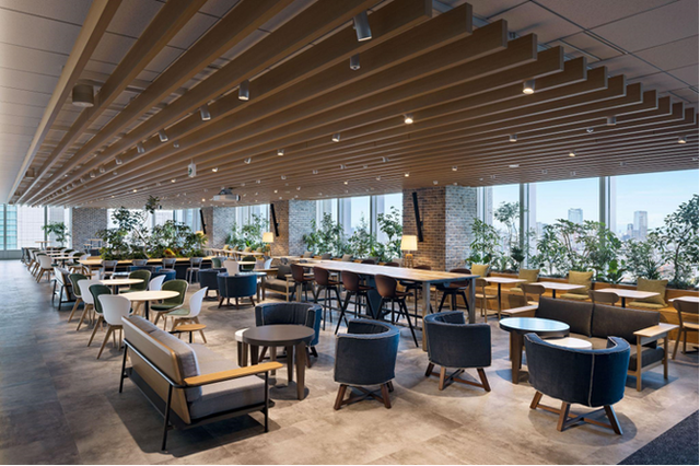 最後に、カフェテリアを紹介。こちらは約150席が用意された憩いの場で、ランチや小休憩に利用されます。非現実的でSFチックな白い空間と、自然で温かみのあるウッドが共存している不思議なデザインです。港区に位置することもあり、窓からはオフィスビル群から東京タワー、東京スカイツリーも見られます。