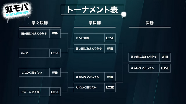 決勝トーナメントは、1試合先取(4ラウンド先取)制で進行。予選上位の「ドンピ戦隊」と「まるいりンごシャン」がシード枠となるなか、1回戦では「とにかく勝ちたい」と「菌っ菌に冷えてやがる」が準決勝へ駒を進めました。