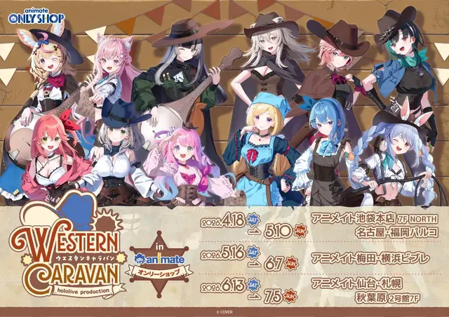 また4月18日から7月5日まで「ホロライブプロダクション ウエスタンキャラバン in animate」を開催。期間中、対象グッズを2,200円(税込)購入・予約するごとにブロマイド(全3種)が1枚プレゼントされます。書籍は1冊、オーディオ・ビジュアル商品は1点ごとにも同様の特典が付与されます。
