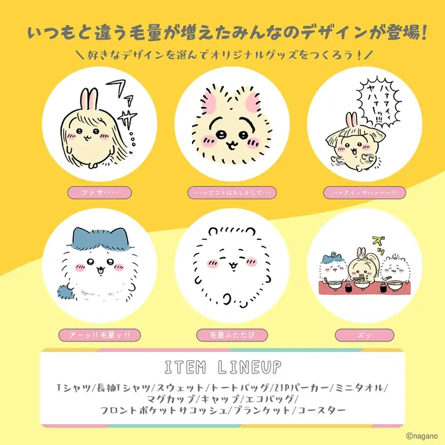 デザインはうさぎの髪がなびく「ファサ・・・」や、ちいかわとハチワレそれぞれの毛量が増えた「毛量ふたたび」「アーッ!!毛量ッ!!」含む全6種がラインナップ。お好みで、Tシャツやフロントポケット付サコッシュ、トートバッグ、マグカップなどを購入できます。