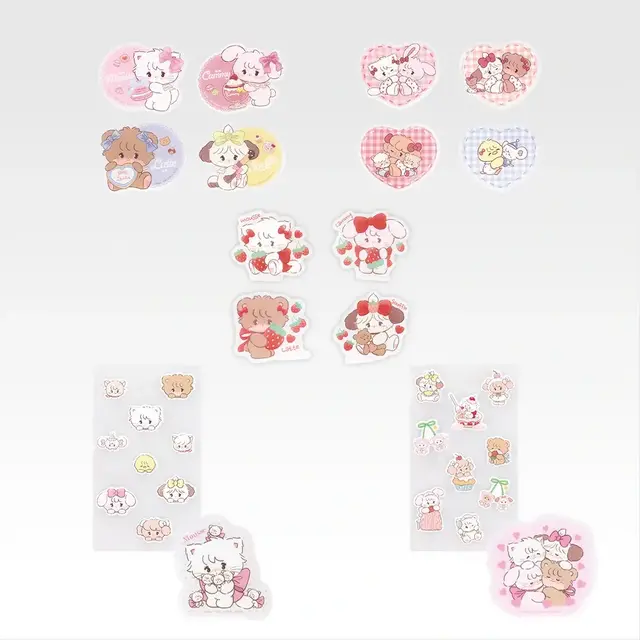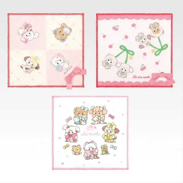 C賞は描き下ろしイラストと同デザインのぬいぐるみマスコットで、「ムース」「ラテ」「キャミー」「スフレ」の4種類を用意。この他にも、ハート型のチークやパフュームチャーム、リボン付きハンドタオルなどがラインナップされています。