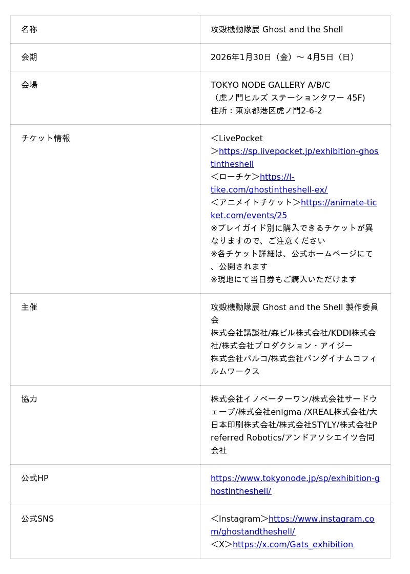 攻殻機動隊展 Ghost and the Shell 製作委員会(株式会社講談社、森ビル株式会社、KDDI株式会社、株式会社プロダクション・アイジー、株式会社パルコ、株式会社バンダイナムコフィルムワークス)は、2026年1月30日(金)から4月5日(日)まで、虎ノ門ヒルズの情報発信拠点「TOKYO NODE(東京ノード)」にて開催する『攻殻機動隊展 Ghost and the Shell』(以下、本展)にて販売する全シリーズを横断した100種以上の展覧会オリジナルグッズ、80種を超えるコラボアイテムのほぼすべての商品情報を公開しました。